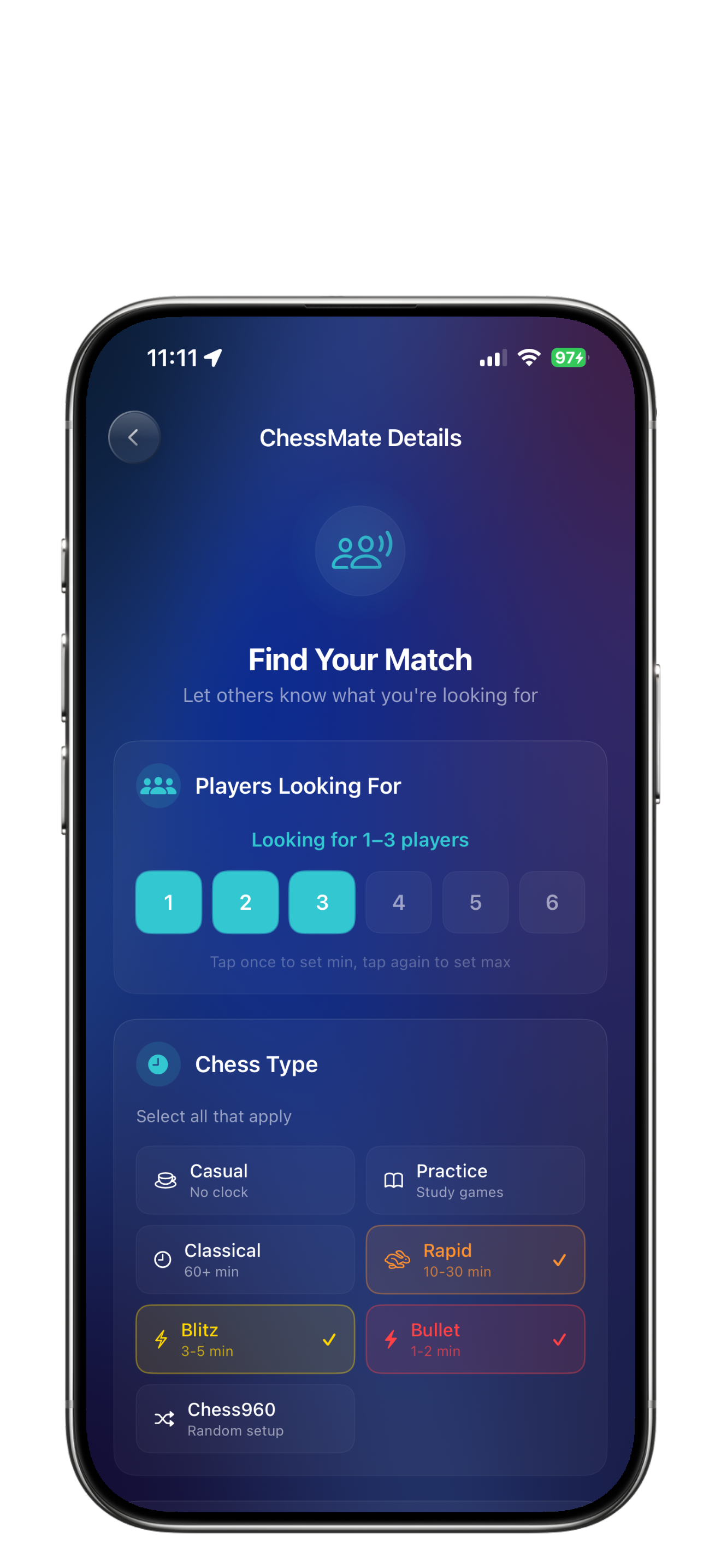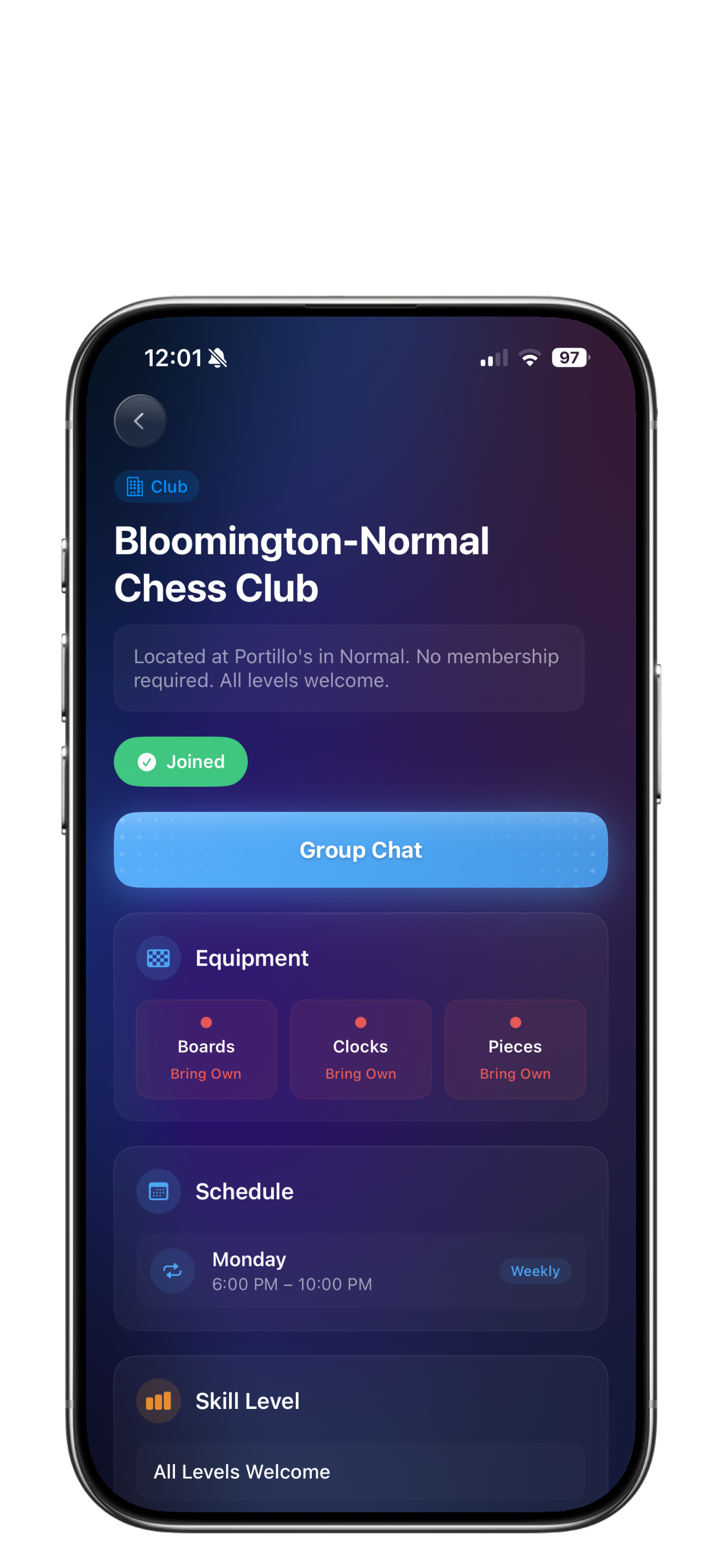 Explore a live map to find places where chess is being played around you. View details like skill level, equipment available, and what’s happening at each location. See which spots are active and jump into games nearby. Quickly get directions and start playing.